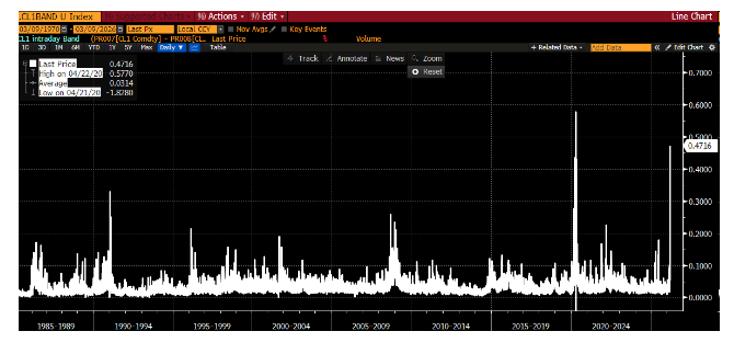 Excluyendo el periodo en el que el planeta estuvo confinado, hoy es el mayor rango intradía de negociación de la historia para el crudo CL1.
