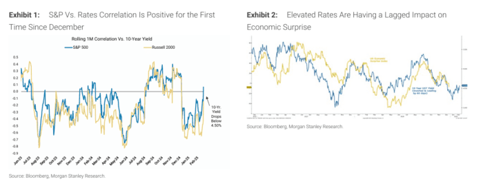 En diciembre, identificamos este nivel como un umbral clave para la valoración de las acciones. Nuestra visión se basaba en la sensibilidad previa de la renta variable a los tipos de interés observada en abril de 2024 y el otoño de 2023, cuando el rendimiento del bono a 10 años superó este nivel. En nuestra opinión, el mercado de renta variable ha estado indicando que rendimientos por encima de este punto aumentan la probabilidad de afectar el crecimiento (más sobre esto a continuación).