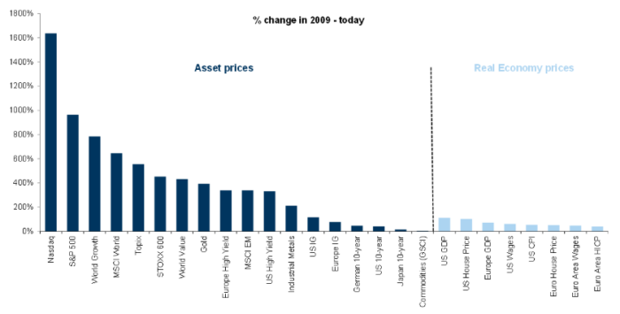 Activos financieros frente a activos físicos. Dado el reciente comportamiento, en el que las compañías intensivas en capital han superado a las compañías “ligeras” en capital, he estado pensando en este gráfico de Peter Oppenheimer que ya habéis visto antes. No estoy diciendo que espere que el Nasdaq 100 (NDX) se desmorone; más bien, el gráfico sugiere que había margen para una recuperación relativa (catch-up) en ciertos activos que se habían quedado rezagados
