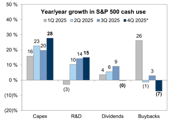 En línea con el punto nº2 anterior, el gráfico de Ben Snider muestra que el año pasado se produjo un cambio amplio en el uso corporativo del efectivo: aumentaron el capex y el gasto en I+D, mientras que los dividendos y las recompras disminuyeron.Dependiendo del horizonte temporal, se pueden construir distintas narrativas sobre este giro. Pero viendo la reciente acción del precio en los hyperscalers, el mercado claramente se había acostumbrado a una fuerte devolución de capital al accionista.