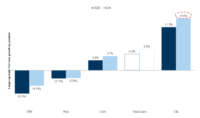 Uno de los mensajes tras los resultados de los grandes bancos fue el aumento en la concesión de préstamos. Los datos muestran que el crecimiento interanual del crédito entre los siete mayores bancos de EE. UU. aumentó 150 puntos básicos en el cuarto trimestre, con mejoras generalizadas por categorías, especialmente en préstamos comerciales e industriales (C&I).