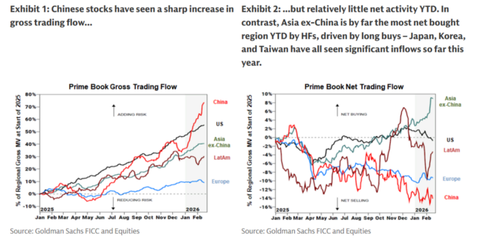 Curiosamente, la renta variable china ha registrado un fuerte aumento en la actividad bruta de negociación, pero con relativamente poco posicionamiento neto en lo que va de año (YTD), lo que sugiere mayor participación sin una convicción clara.