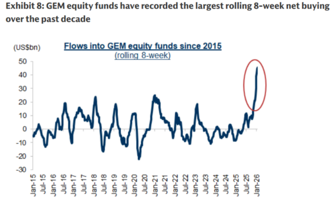 Los mercados emergentes (EM) siguen destacando claramente: los fondos GEM (Global Emerging Markets) acumulan ya 18 semanas consecutivas de entradas, incluyendo 4.300 millones de dólares esta semana, lo que eleva las entradas en lo que va de año (YTD) a 45.000 millones de dólares.