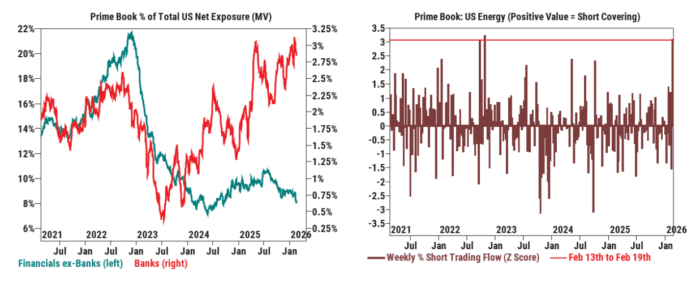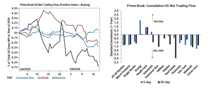 Los flujos en EE. UU. refuerzan esta postura defensiva. Los hedge funds han sido vendedores netos de renta variable estadounidense en tres de las últimas cuatro sesiones (-1,3 desviaciones estándar frente a la media del último año), impulsados principalmente por ventas en corto.
