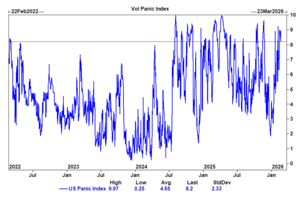 Nuestro Vol Panic Index se sitúa en 8,2 sobre 10, lo que indica una fuerte demanda de “skew” (protección asimétrica) y cobertura ante el riesgo de que la volatilidad que afecta a acciones o sectores concretos se extienda al conjunto del índice.