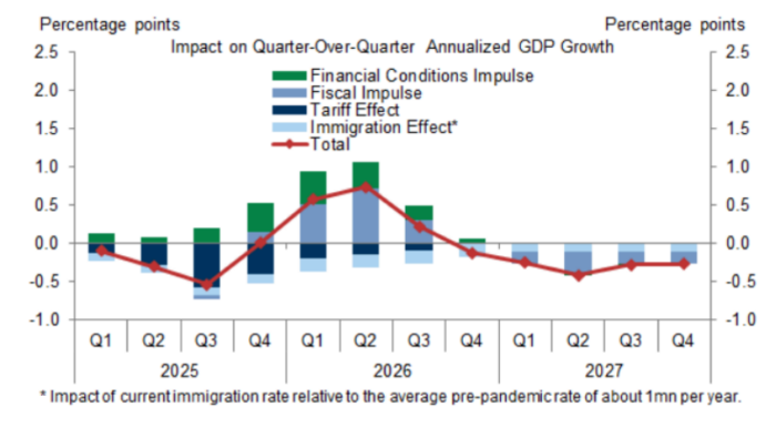 GS Research ha iniciado el seguimiento del PIB para el 1T26 en el 3,4% (impulsado por la normalización tras el cierre del gobierno) y mantiene su previsión de crecimiento del 2,5% interanual para el 4T26 frente al 4T25, lo que supondría una aceleración respecto a 2025 a medida que se diluye el lastre de los aranceles y los recortes fiscales aportan un modesto impulso adicional.
