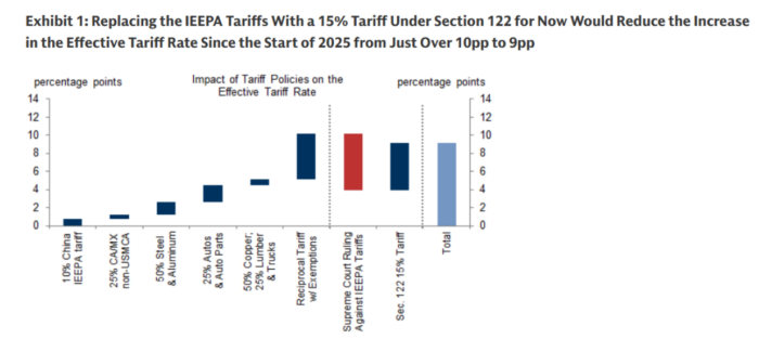 Los recientes acontecimientos en materia de aranceles estuvieron en gran medida en línea con las expectativas: la combinación del fallo del Tribunal Supremo y el nuevo arancel anunciado bajo la Sección 122 aún reduce la tasa arancelaria efectiva desde algo más de 10 puntos porcentuales hasta aproximadamente 9 puntos. La mayor parte del impacto inflacionario ya se ha trasladado: estimamos que los aranceles elevaron el PCE subyacente en alrededor de un 0,7% hasta enero, y solo se espera una presión adicional de aproximadamente un 0,1% durante el resto de 2026.