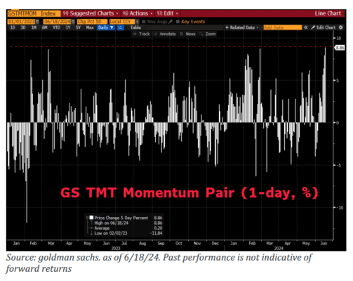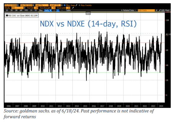 La amplitud sigue siendo un enfoque de este mercado: NDX vs. NDX Equalweight +6% en el último mes (14d RSI = 81)… Par de Momentum TMT +12% en el último mes y ahora +45% en lo que va del año… gráfico a continuación: par NDX vs. NDXE: RSI de 14 días ahora ~81