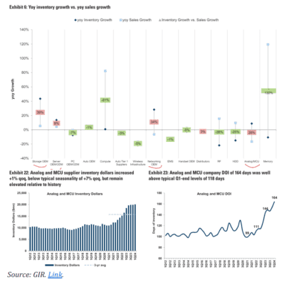Semiconductores… revisión de inventarios de GIR después de los resultados del 1T (~80 empresas en la base de datos – enlace)… a un alto nivel, Toshiya/GIR se siente alentado por las reducciones en el inventario en ciertas partes de la cadena de suministro (por ejemplo, RF, Distribuidores) – sin embargo, Toshiya señala que el inventario elevado, particularmente en mercados finales o aplicaciones como Automotriz y Redes, podría afectar el ritmo de la recuperación de ingresos pendiente y, a su vez, las acciones.