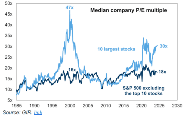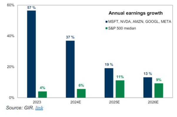 Ganado, no dado… la pregunta, por supuesto, es, ¿hacia dónde vamos desde aquí? Kostin/GIR destaca que la prima de crecimiento de EPS de las mega-cap tech se reducirá, ya que la diferencia de 31 puntos porcentuales en 2024 se comprimirá a 8 puntos porcentuales en 2025 y 4 puntos porcentuales en 2026.