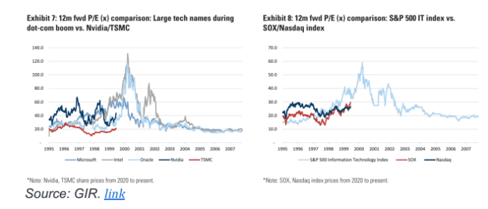 TSM… nota optimista de Bruce/GIR hoy sobre el nombre (enlace)… bastante atención de los inversores en TSM últimamente (poder de fijación de precios + aumento de CoWoS + trayectoria de capex + prima de ADR) ya que el sentimiento está mejorando (solo más debate sobre las “matemáticas” para el alza)… en una nota de hoy, Bruce actualiza sus estimaciones sobre los precios (por ejemplo, pronostica que TSMC aumentará sus precios para 3nm/5nm en un +LSDs % y CoWoS en un +5% a partir de 2025… frente a una disminución de ~LSDs anteriormente) y opina sobre dónde estamos en el ciclo de IA en comparación con los booms de productividad liderados por la innovación en el pasado, como el boom de las dot-com.