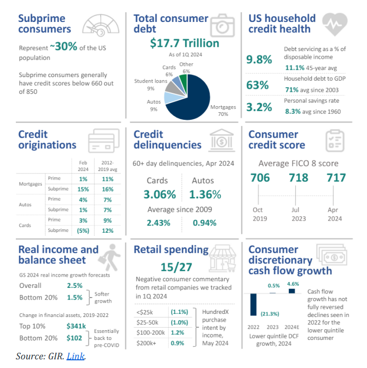 Estado del consumidor subprime… Los consumidores subprime (puntaje de crédito de 660 o menos) constituyen aproximadamente el 30% de la población de EE. UU. y están mostrando signos de tensión financiera en el entorno macroeconómico actual [imagen mixta de la salud crediticia del consumidor, con pagos de servicio de la deuda como porcentaje del ingreso disponible y apalancamiento como porcentaje del PIB nominal por debajo de los promedios históricos, equilibrados por tasas de ahorro personal que han caído a casi mínimos históricos, desaceleración del crecimiento salarial y confianza del consumidor deprimida y en declive entre los cohortes de ingresos más bajos]. Ver lo último de GIR hoy: