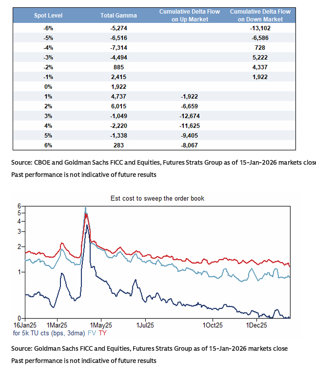 El posicionamiento neto largo institucional en renta variable de EE. UU. no está lejos de los máximos en términos nominales y se sitúa alrededor del percentil 85 en base normalizada. El bloque sistemático/CTA también está cómodamente largo (por encima de 8 sobre 10), con algo de compra adicional de base esperada durante el próximo mes. Nuestras estimaciones de gamma del SPX son algo contracíclicas para los primeros movimientos del spot del ±3% en cualquiera de las dos direcciones en el momento actual. La liquidez, medida como el coste estimado de barrer el libro de órdenes, se encuentra cerca de máximos de un año o mejor que la media en muchos de los principales mercados globales de futuros de renta variable y bonos que seguimos.