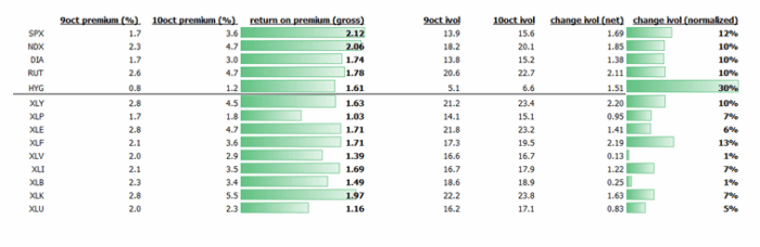 El análisis se centró en el coste de una opción put al 100% de strike con vencimiento en noviembre en los 14 índices y ETFs más líquidos el 9 de octubre, y en cómo cerró esa misma opción el 10 de octubre.
