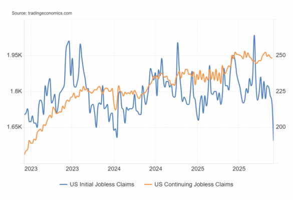Las solicitudes iniciales de desempleo en EE. UU. cayeron en 27.000 respecto a la semana anterior, hasta 191.000 en la última semana de noviembre, encadenando cuatro descensos consecutivos y situándose muy por debajo de las expectativas del mercado (220.000), en su nivel semanal más bajo desde 2022. Mientras tanto, las solicitudes continuadas bajaron en 4.000, hasta 1.939.000 en el periodo anterior. Los resultados están en línea, aunque de forma moderada, con otros datos del mercado laboral que muestran que los despidos están disminuyendo, mientras que una fuerte reducción en la actividad de contratación mantiene los niveles de solicitudes de desempleo relativamente altos.