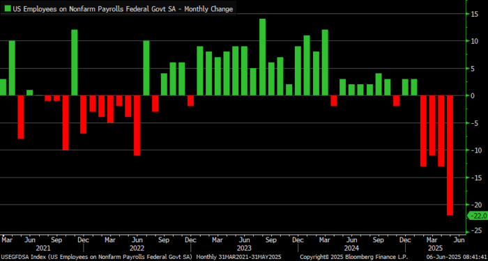 El cambio en el empleo total de nóminas no agrícolas para marzo fue revisado a la baja en 65.000, de +185.000 a +120.000, y el de abril fue revisado a la baja en 30.000, de +177.000 a +147.000. Con estas revisiones, el empleo combinado de marzo y abril es 95.000 inferior al informado previamente. (Las revisiones mensuales se deben a informes adicionales de empresas y agencias gubernamentales desde la publicación anterior y al recálculo de los factores estacionales) Los datos de empleo de todos los meses durante la administración Trump han sido revisados a la baja, lo cual no es algo nuevo, ya que prácticamente todos los meses bajo la administración Biden también fueron corregidos a la baja uno o dos meses después.