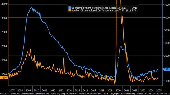 El empleo según la encuesta a hogares cayó en 696.000 personas en mayo, frente a un aumento de +461.000 el mes anterior, lo que representa la mayor caída desde diciembre de 2023.