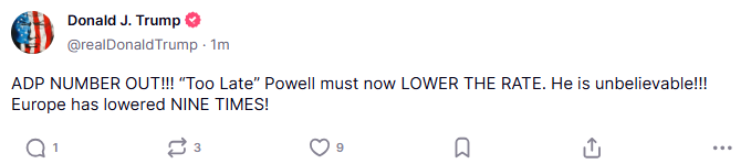 TRUMP: «¡¡¡SE HA PUBLICADO EL NÚMERO DE ADP!!! «Demasiado tarde», Powell ahora debe BAJAR LA TASA. ¡Es increíble! ¡Europa la ha bajado NUEVE VECES!