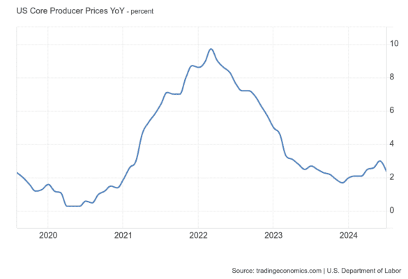 Los precios a la salida de fábrica en los EE. UU. aumentaron un 0.1% mensual en julio de 2024, tras un aumento del 0.2% en junio y por debajo de las previsiones del 0.2%.