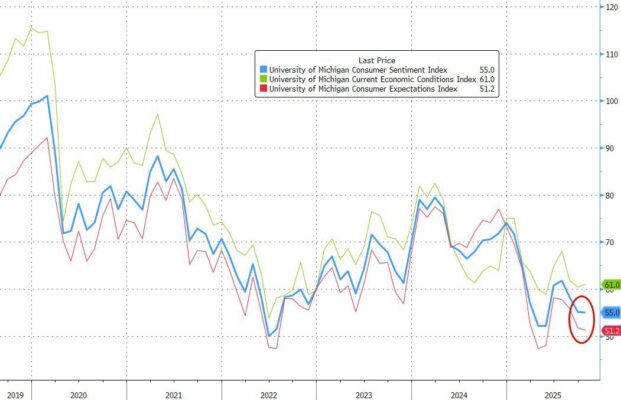 El índice de sentimiento del consumidor de la Universidad de Michigan para Estados Unidos se situó en 55 puntos en octubre de 2025, frente a 55,1 en septiembre y por encima de las previsiones de 54,2, según las estimaciones preliminares.