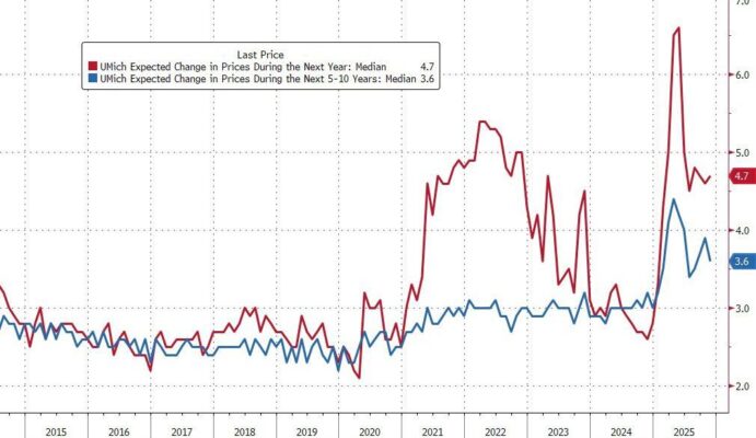 Las expectativas de inflación mostraron un comportamiento mixto: la inflación a un año subió ligeramente del 4,6% al 4,7%, mientras que las expectativas a largo plazo bajaron del 3,9% al 3,6%.