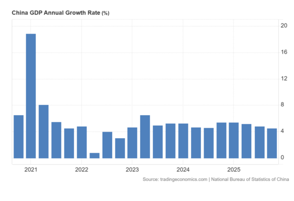 La economía de China creció un 4,5 % interanual en el 4T de 2025, desacelerándose desde el 4,8 % del 3T y marcando el avance más débil en tres años. El dato se produjo en un contexto en el que las ventas minoristas de diciembre crecieron a su ritmo más bajo en tres años, lastradas por la prolongada crisis inmobiliaria y las presiones deflacionistas, pese a los continuos subsidios al consumo.