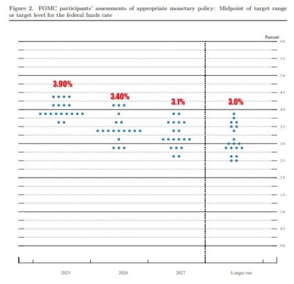 Aquí está el Dot Plot de la Reserva Federal (esto muestra lo que cada miembro del Comité piensa que harán los tipos de interés al final del año):