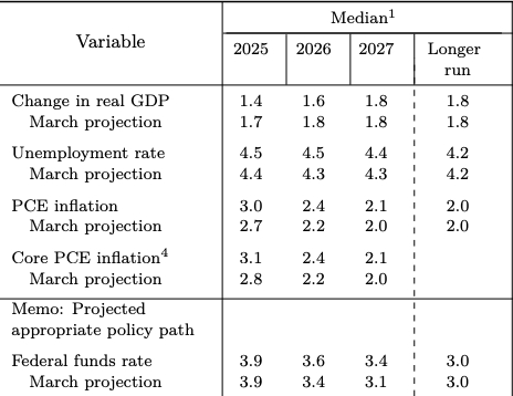 Esto es lo que la Reserva Federal espera actualmente para finales de 2025 según el SEP (Resumen de Proyecciones Económicas): Tipos de interés: terminarían 2025 en el rango del 3,75%-4% (dos recortes de 25 puntos básicos), sin cambios respecto a su previsión anterior. Crecimiento (PIB): del 1,4%, por debajo del 1,7% previsto anteriormente. Tasa de desempleo: del 4,5%, por encima del 4,4% previsto anteriormente. Inflación (PCE): del 3%, frente al 2,7% de la previsión anterior. (El SEP se actualiza una vez por trimestre y no debe interpretarse como lo que van a hacer, sino más bien como lo que esperan actualmente en función de las condiciones vigentes)