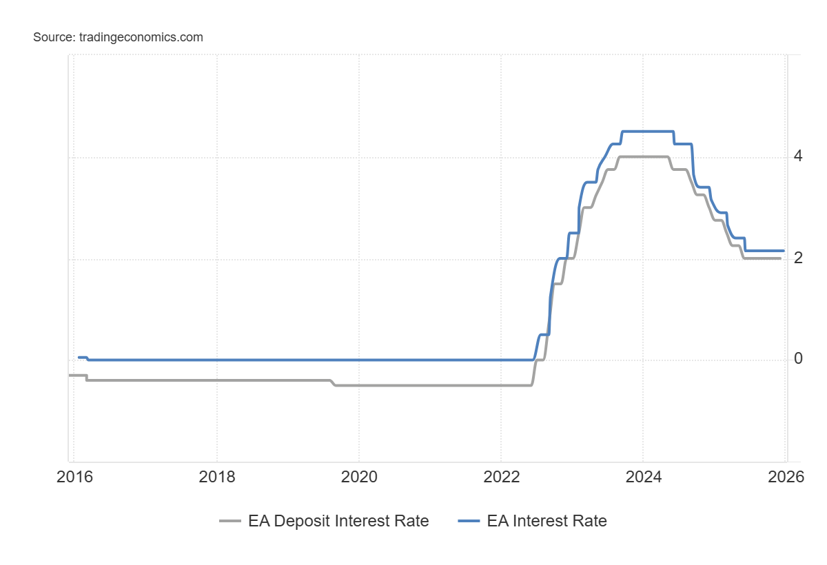 El BCE mantuvo los costes de financiación sin cambios por cuarta reunión consecutiva en diciembre de 2025, con el tipo principal de refinanciación en el 2,15% y la facilidad de depósito en el 2,0%. La decisión estuvo en línea con lo esperado. Los responsables reiteraron que seguirán un enfoque dependiente de los datos y reunión a reunión para determinar la orientación adecuada de la política monetaria.
