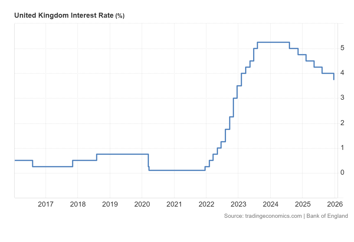 El Banco de Inglaterra recortó el tipo oficial en 25 puntos básicos hasta el 3,75%, su nivel más bajo desde 2022, ante la moderación de la inflación y las crecientes señales de tensión económica, lo que llevó a los responsables de política monetaria a actuar. El movimiento supuso el primer recorte de tipos desde agosto.