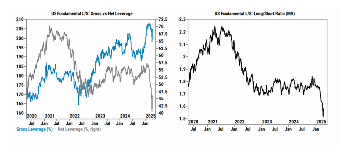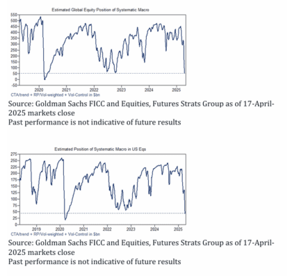 Estimamos que la rebalanceación macro sistemática ya se ha completado en gran medida, con la exposición a renta variable global cayendo de aproximadamente un 8 sobre 10 en los máximos de febrero/principios de año a un 1 sobre 10 actualmente, lo que equivale a 53.000 millones de USD y representa una posición corta por parte de CTAs / seguidores de tendencia, además de exposiciones mínimas de un año en estrategias de paridad de riesgo y productos de control de volatilidad (vol-control).