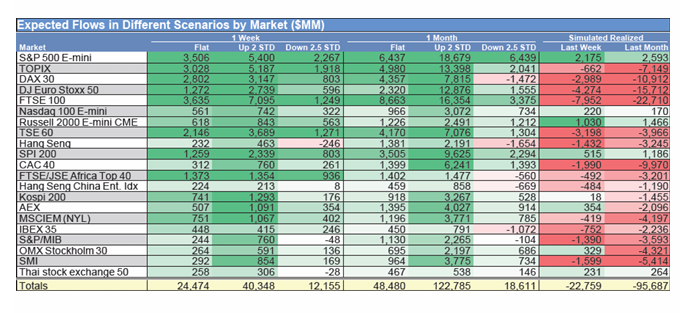 Para el SPX, tenemos a los CTAs como compradores modelizados en todos los escenarios para la próxima semana y el próximo mes.