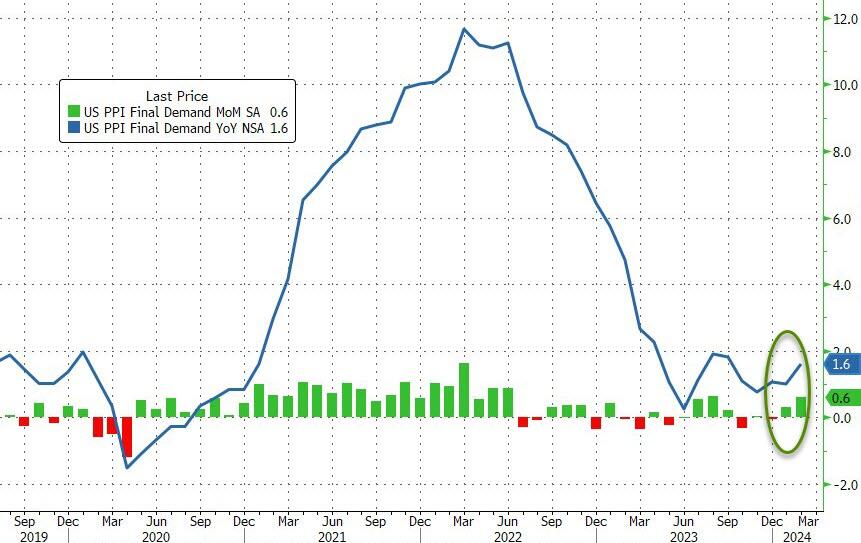 El Índice de Precios al Productor para la demanda final en los Estados Unidos aumentó un 0.6% mes a mes en febrero de 2024, marcando el mayor incremento desde agosto pasado y superando las expectativas del mercado de un avance del 0.3%.