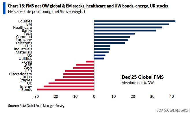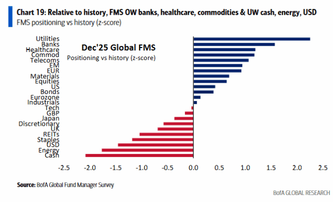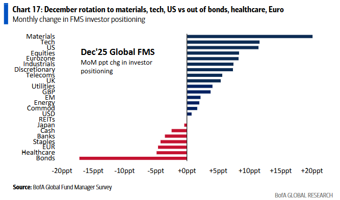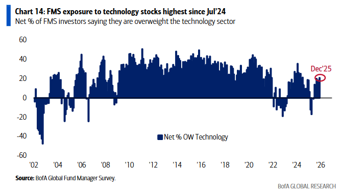 En cuanto a las asignaciones sectoriales, en diciembre los inversores del FMS aumentaron la exposición a tecnología hasta un sobrepeso neto del 21%, el nivel más alto desde julio de 2024.