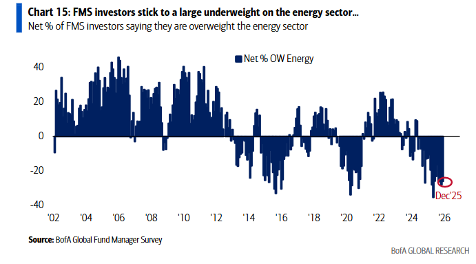 La asignación a energía se mantuvo en un –26% neto infraponderado en diciembre (ligeramente mejor que el –28% neto del mes anterior).