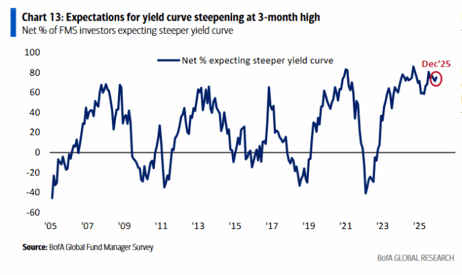 Un 75% neto de los inversores del FMS espera que la curva de tipos se empine en los próximos 12 meses, el nivel más alto desde septiembre de 2025.