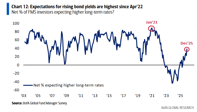 En cuanto a las expectativas sobre los rendimientos de los bonos, un 38% neto de los inversores del FMS en diciembre espera que los tipos de interés a largo plazo sean más altos dentro de 12 meses, el nivel más elevado desde abril de 2022.