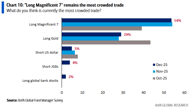“Largo en los Magnificent 7” sigue siendo la operación más congestionada (crowded trade) por segundo mes consecutivo, según el 54% de los inversores del FMS.