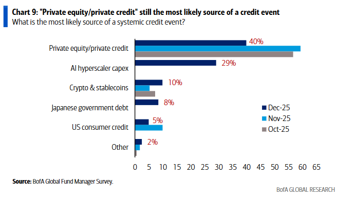 Destaca la incorporación del “crédito privado” este mes, que un 14% de los inversores del FMS considera el mayor tail risk para el próximo año.