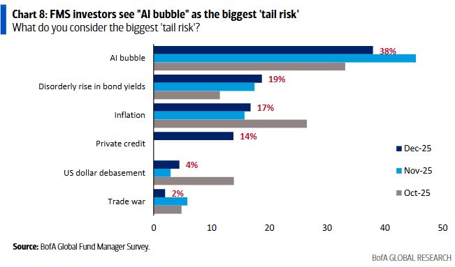 En diciembre, las preocupaciones de los inversores del FMS sobre una “burbuja de IA” retrocedieron ligeramente (del 45% al 38%), aunque siguió siendo el principal tail risk.