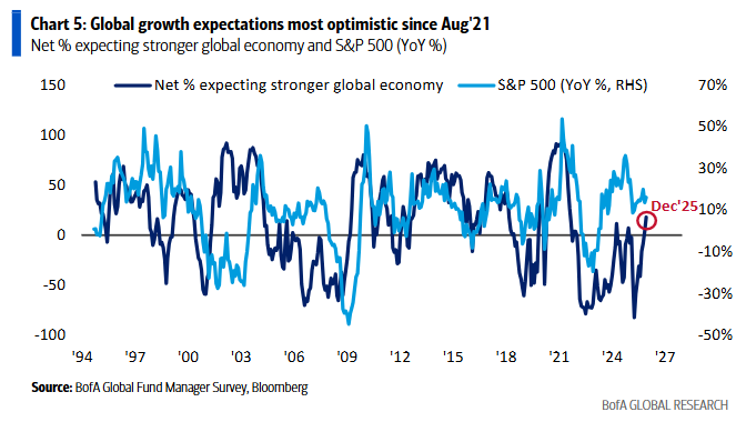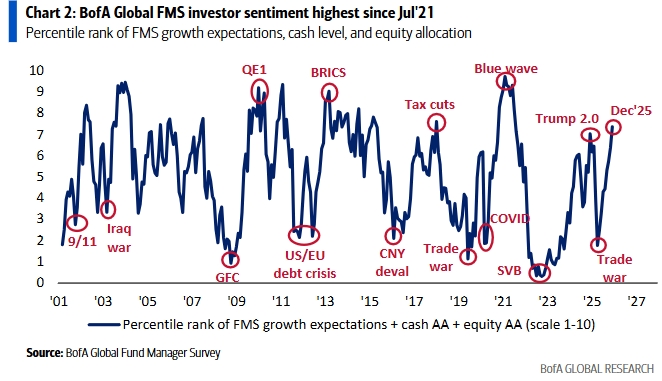 El FMS más alcista de los últimos 3 años y medio, con el optimismo macroeconómico en su nivel más alto desde agosto de 2021, basado en la creencia de un escenario de “run-it-hot” (economía funcionando por encima de su potencial).