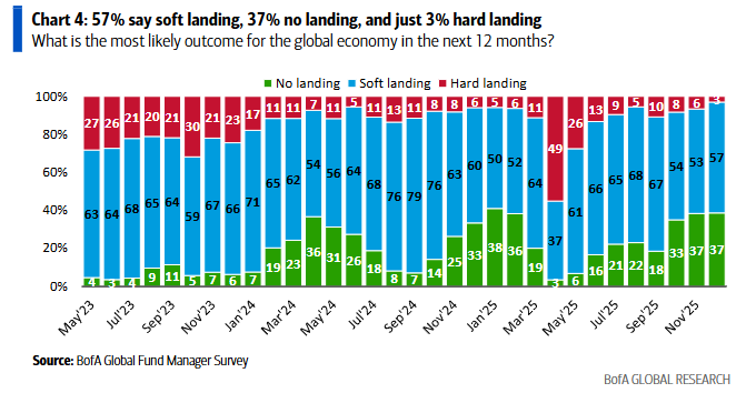 Preguntados por el escenario más probable para la economía global en 2026, el 57% espera un soft landing y el 37% espera un no landing, mientras que solo un 3% anticipa un hard landing, el nivel más bajo de los últimos dos años y medio.