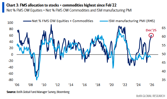 El optimismo de diciembre impulsó la asignación a activos cíclicos de riesgo (renta variable + materias primas) hasta el nivel más alto desde febrero de 2022.