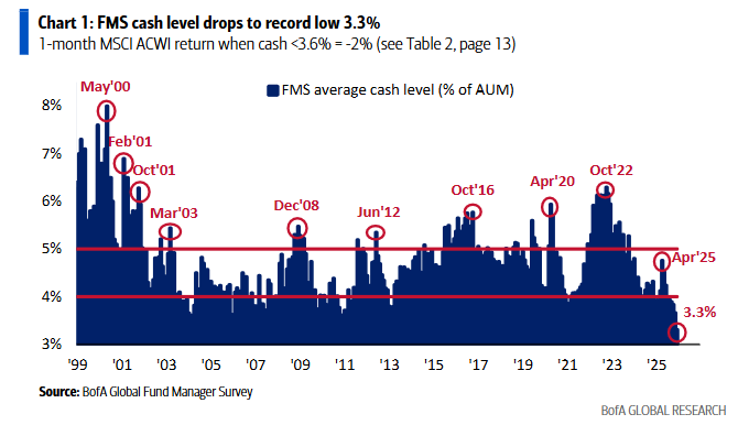 La asignación a acciones y materias primas es la más elevada desde febrero de 2022, mientras que el nivel de liquidez cae a un mínimo histórico del 3,3% (desde el 3,7%).