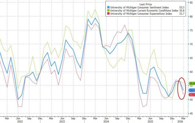 El índice de confianza del consumidor de la Universidad de Michigan cayó con fuerza hasta 53,3 en marzo de 2026, desde la estimación preliminar de 55,5 y por debajo del 56,6 de febrero. Esto sitúa la confianza cerca de los mínimos registrados a finales de 2025, con descensos en todos los grupos de edad y afiliaciones políticas.