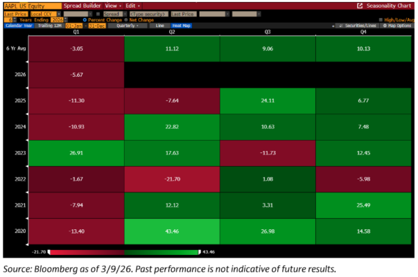 (el consenso espera ~20,40 $ por acción en EPS GAAP en CY27, según Bloomberg) y se encuentra ahora en niveles relativos frente al mercado cercanos a mínimos de más de 5 años — gráfico inferior.