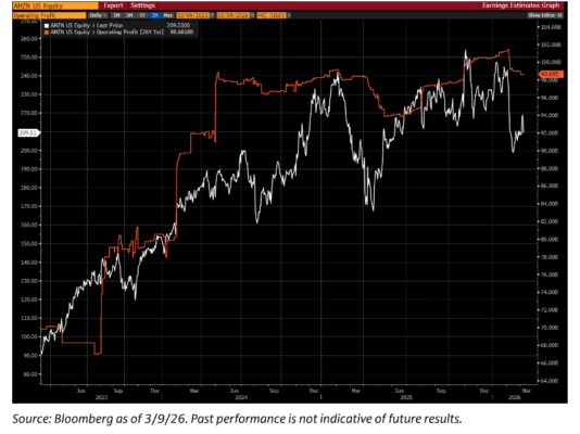 … en medio de este debate creciente (teniendo en cuenta que Amazon cotiza ahora con solo ~10% de prima frente al mercado en P/E forward), merece la pena destacar que las estimaciones de consenso sobre el beneficio operativo prácticamente se han estancado en los últimos trimestres/años, según el gráfico EEG inferior (estimaciones de beneficio operativo de consenso para 2026 en naranja).