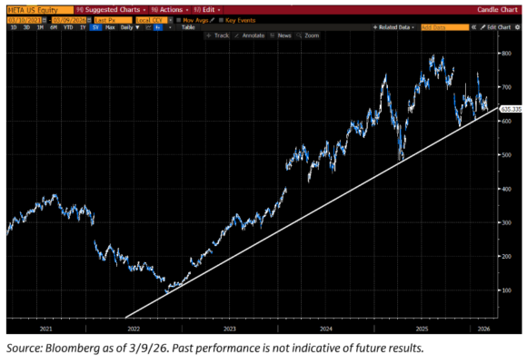… en medio de una caída complicada de tres días (Meta -5% en tres sesiones), la acción vuelve a poner a prueba una línea de tendencia clave que ha respetado varias veces en los últimos años — gráfico inferior.