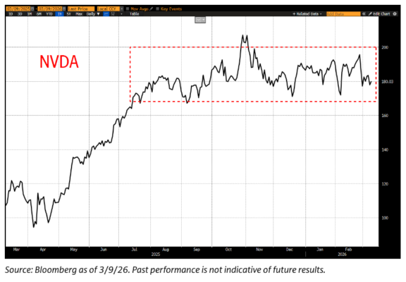…no estamos revelando nada nuevo, pero a pesar de la abundancia de titulares positivos sobre IA y/o revisiones al alza (incluyendo los resultados de hace aproximadamente 3 semanas), Nvidia ha permanecido en rango durante los últimos ~8 meses.