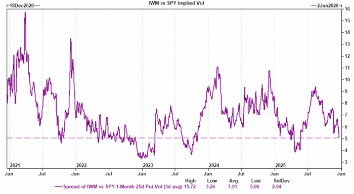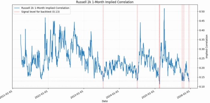 El mercado de volatilidad no está descontando una probabilidad elevada de un evento de “correlación 1” para el RTY durante el próximo mes. La correlación implícita a 1 mes del RTY se encuentra en su tercer nivel más bajo de los últimos cinco años.